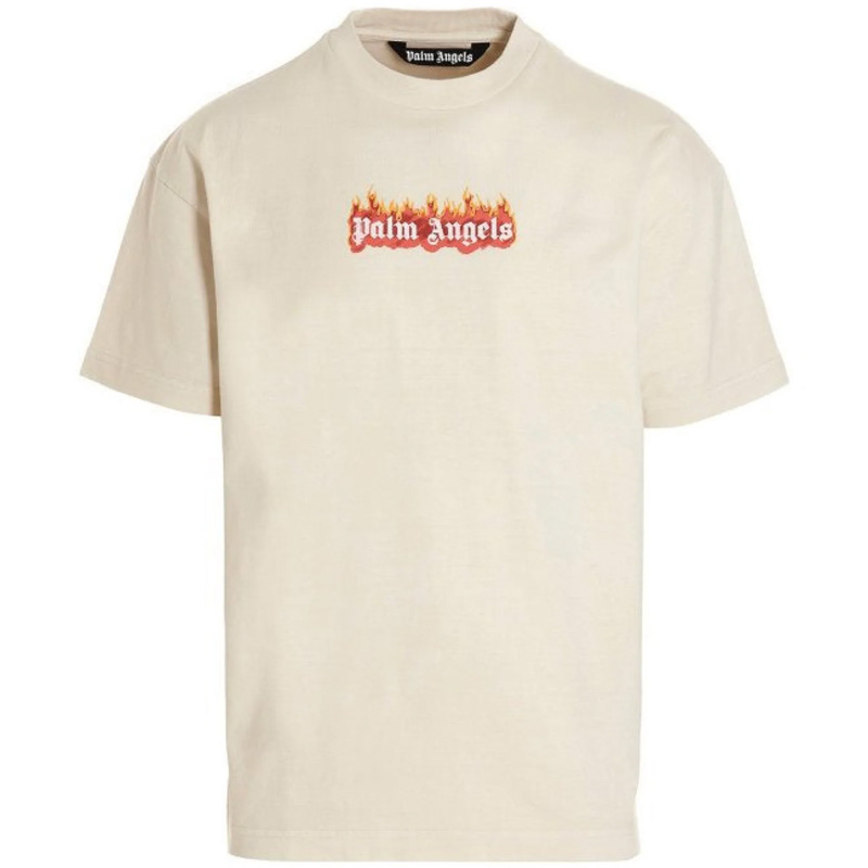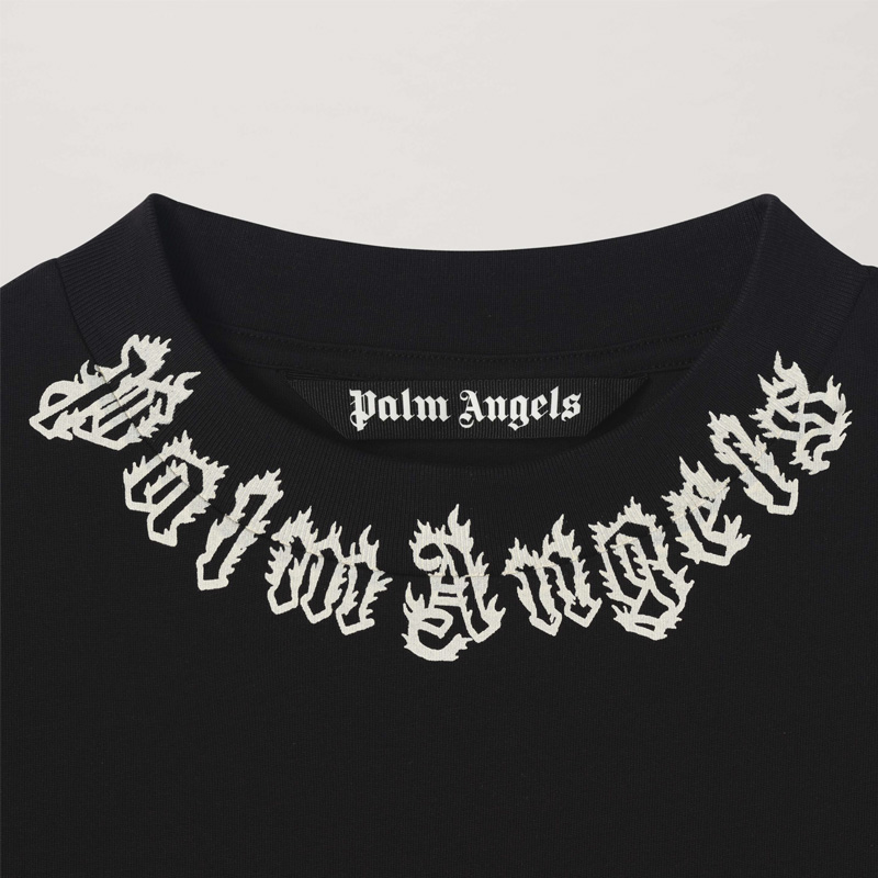 Un diseño emblemático es la Flame Tee, donde el nombre Palm Angels aparece en tipografía gótica en llamas sobre el pecho – una clara alusión a la estética skate-punk californiana (y que recuerda al logo de la revista Thrasher) mezclada con la ironía de la moda de lujo.